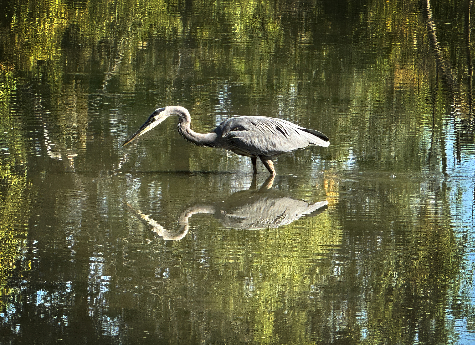 A Great Blue Heron fishes for its lunch on a sunny September midday along Troy Trails in Michigan.