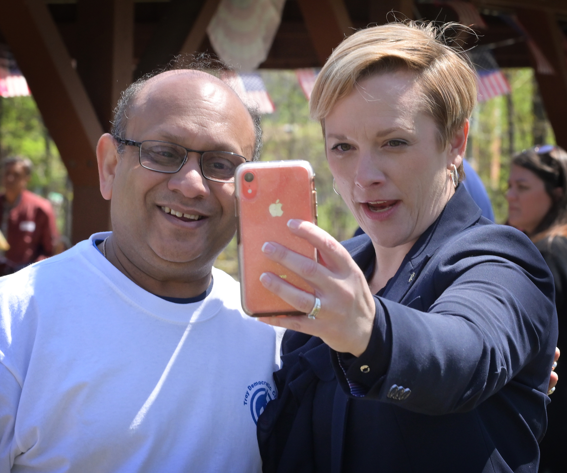 Amanda Shelton — running for Oakland County Circuit Court — takes a selfie with Hirak Chanda, Chair of Troy Democratic Club.